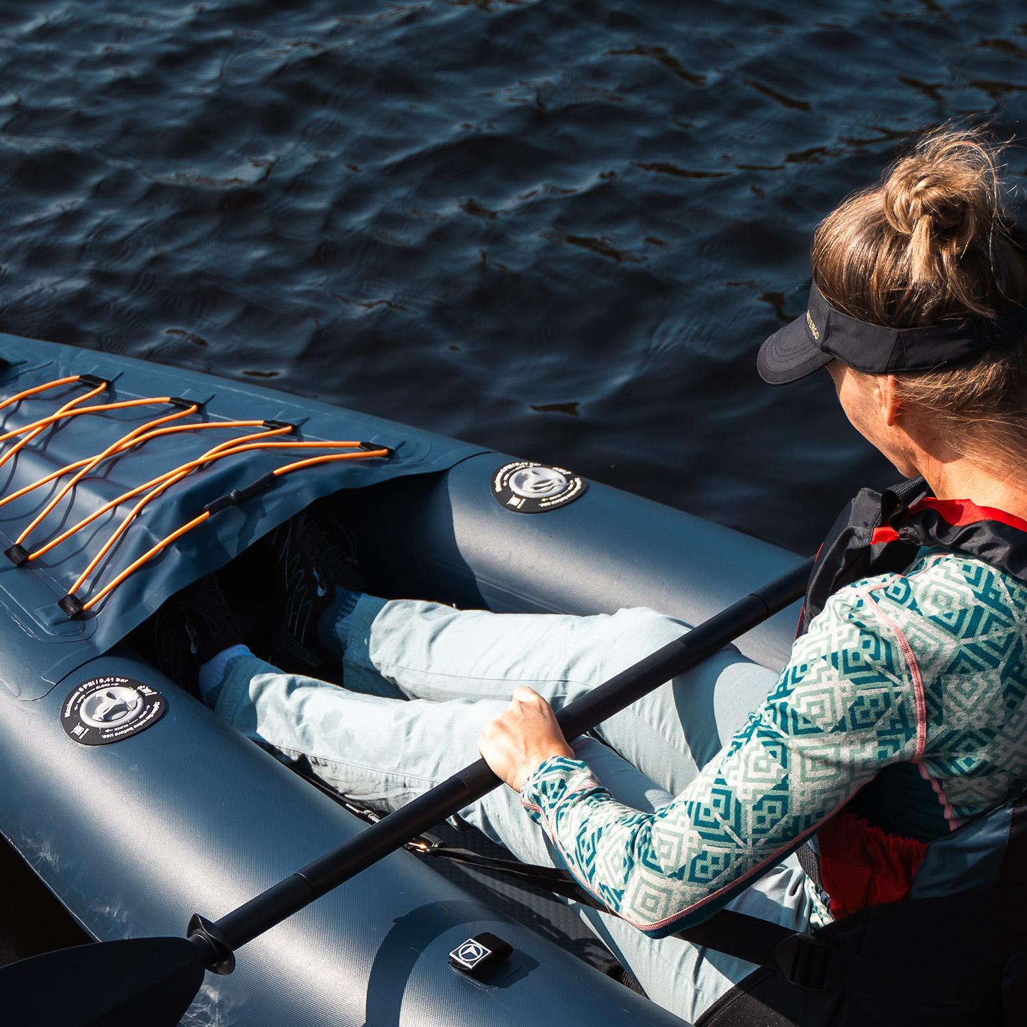 - Enkel å transportere og oppbevare – Den oppblåsbare kajakken kan rulles sammen i en bæreveske som lett får plass i bagasjerommet på bilen eller sykkeltilhenger.